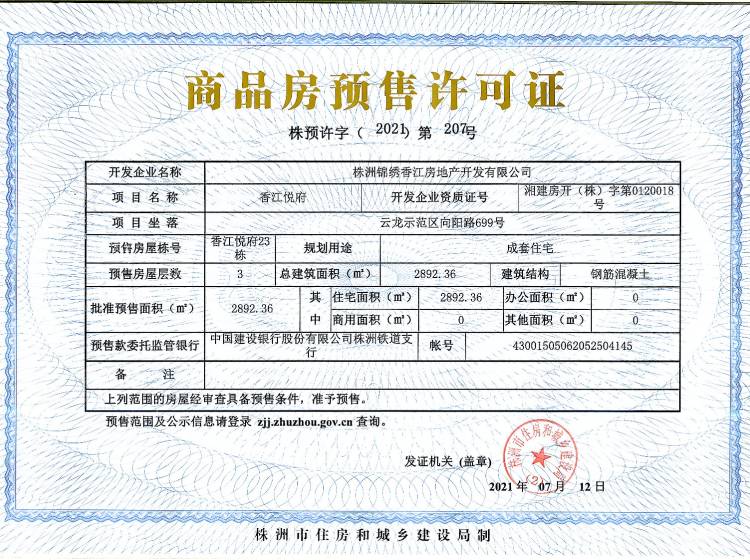 - 预许字(2021)第207号 详情发证时间 2021-07-12绑定楼栋云龙示范区向阳路699号香江悦府23栋