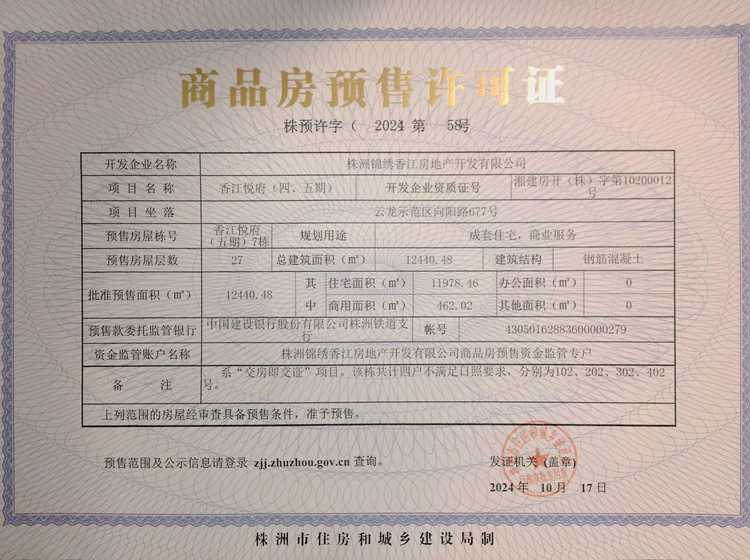 - 预许字(2024)第58号 详情发证时间 2024-10-17绑定楼栋云龙示范区向阳路677号香江悦府(五期)7栋