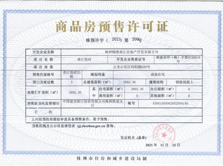 - 预许字(2021)第206号 详情发证时间 2021-07-12绑定楼栋云龙示范区向阳路699号香江悦府25栋