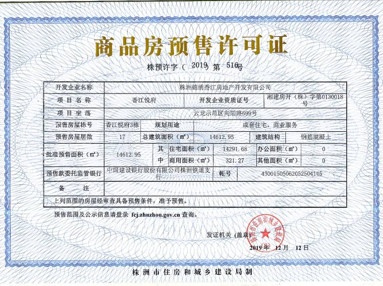 - 预许字(2019)第516号 详情发证时间 2019-12-12绑定楼栋云龙示范区向阳路699号香江悦府3栋