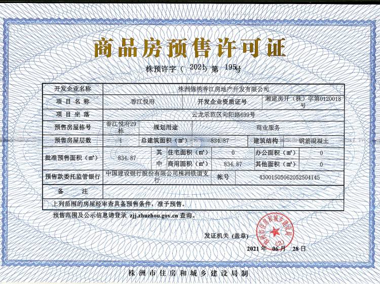 - 预许字(2021)第195号 详情发证时间 2021-06-28绑定楼栋云龙示范区向阳路699号香江悦府29栋