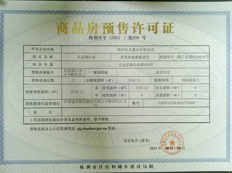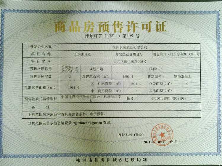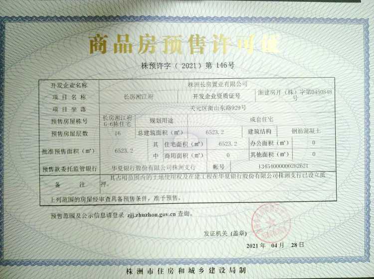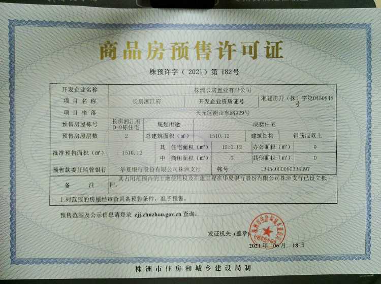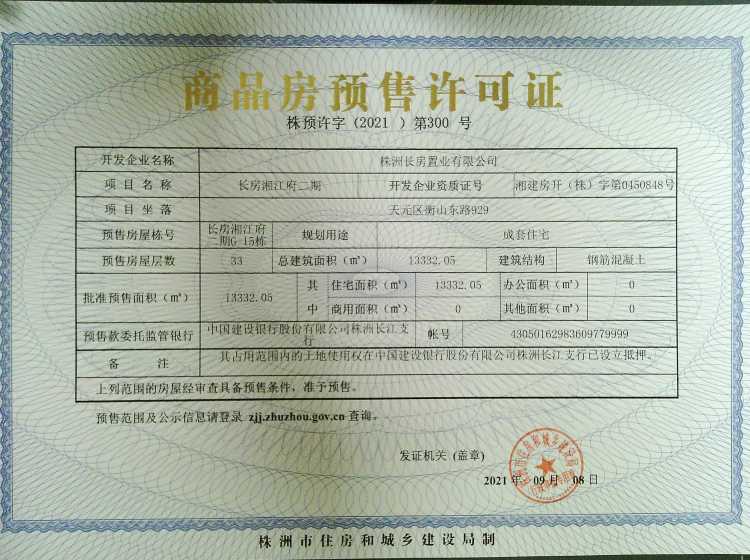 - 预许字(2021)第300号 详情发证时间 2021-09-08绑定楼栋天元区衡山东路929号长房湘江府二期G-15栋