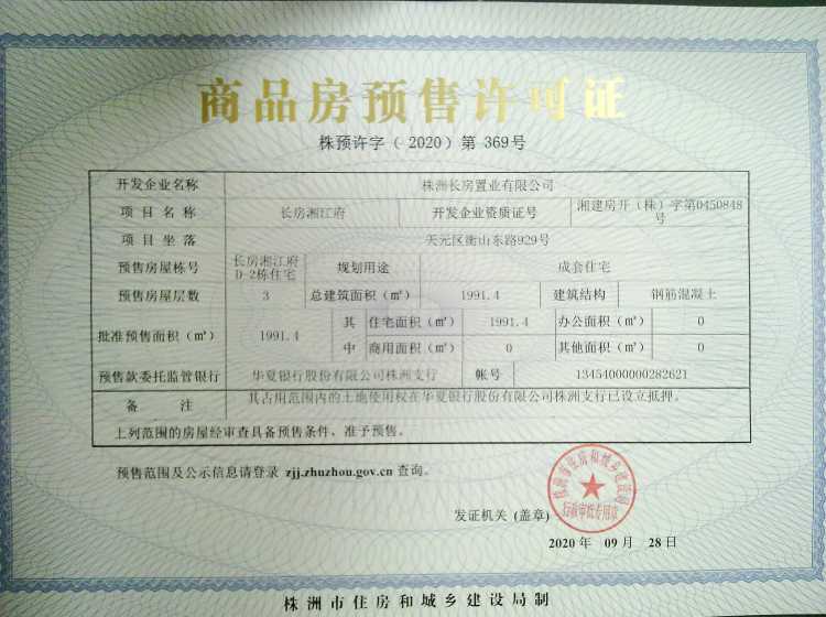 - 预许字(2020)第369号 详情发证时间 2020-09-28绑定楼栋天元区衡山东路929号长房湘江府D-2栋住宅