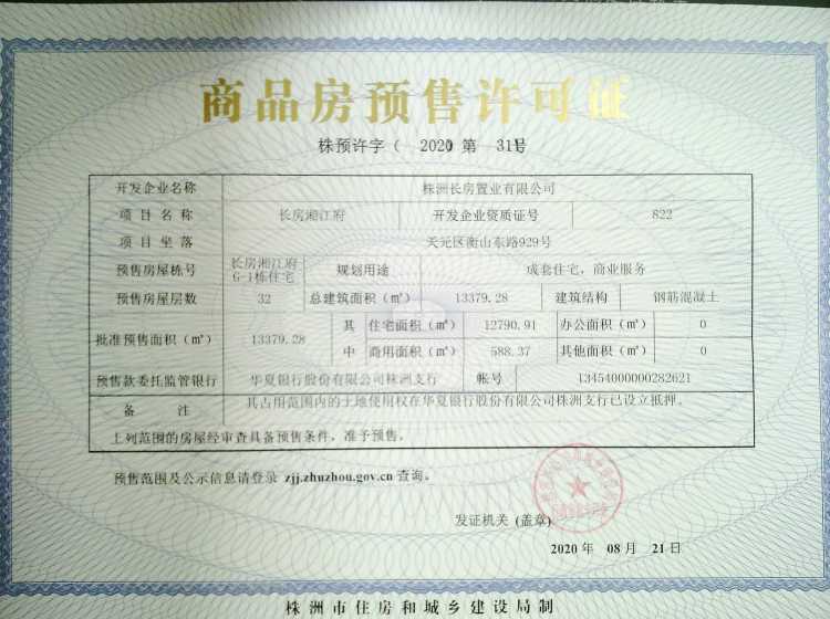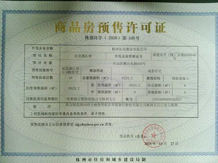- 预许字(2020)第548号 详情发证时间 2020-11-27绑定楼栋天元区衡山东路929号长房湘江府G-8栋住宅