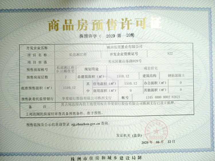 - 预许字(2020)第209号 详情发证时间 2020-06-22绑定楼栋天元区衡山东路929号长房湘江府D-11栋住宅