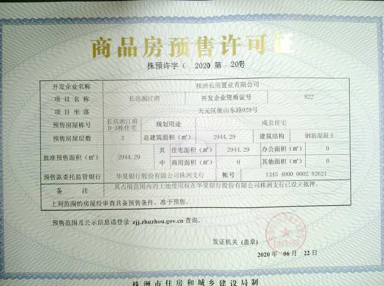 - 预许字(2020)第207号 详情发证时间 2020-06-22绑定楼栋天元区衡山东路929号长房湘江府D-3栋住宅