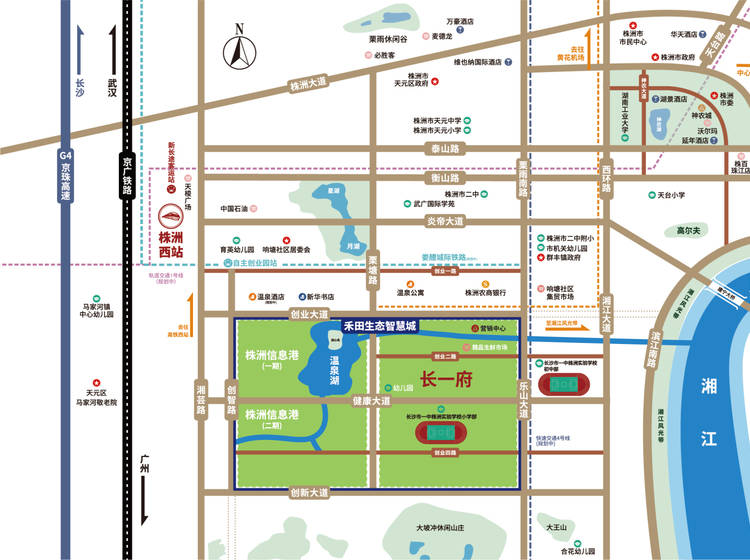 禾田生态智慧城位于天元区武广新城板块,创业大道与栗雨南路的交汇处,临近高铁西站,定位为集文化旅游、商业休闲、科创研发、总部办公、人文居住为一体的都市生态教育新城。