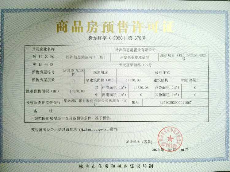 - 预许字(2020)第378号 详情发证时间 2020-09-30绑定楼栋天元区栗塘路1199号株洲信息港清湾8栋