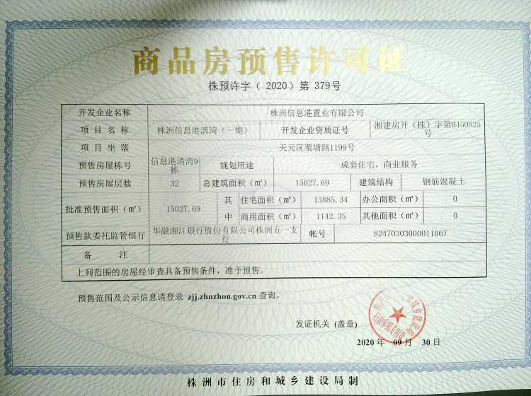 - 预许字(2020)第379号 详情发证时间 2020-09-30绑定楼栋天元区栗塘路1199号株洲信息港清湾9栋