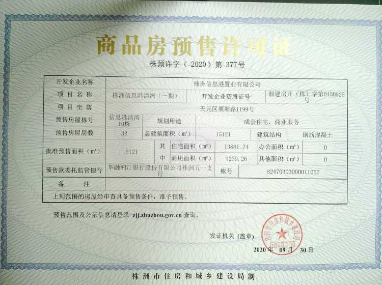 - 预许字(2020)第377号 详情发证时间 2020-09-30绑定楼栋天元区栗塘路1199号株洲信息港清湾10栋