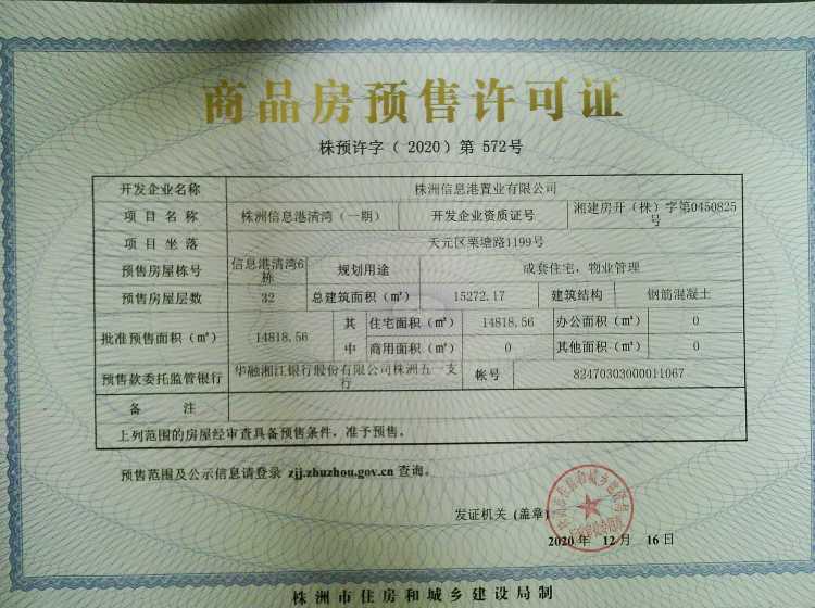 - 预许字(2020)第572号 详情发证时间 2020-12-16绑定楼栋天元区栗塘路1199号株洲信息港清湾6栋
