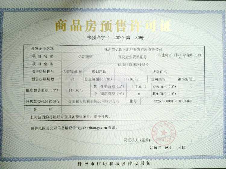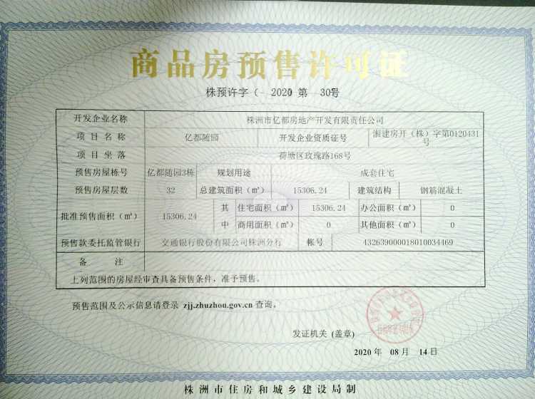 - 预许字(2020)第307号 详情发证时间 2020-08-14绑定楼栋荷塘区玫瑰路168号亿都随园3栋
