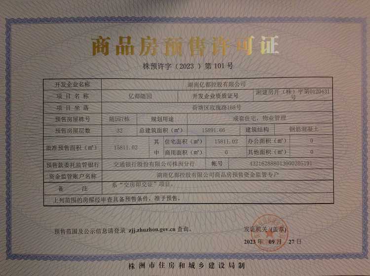 - 预许字(2023)第101号 详情发证时间 2023-09-27绑定楼栋荷塘区玫瑰路168号亿都随园7栋