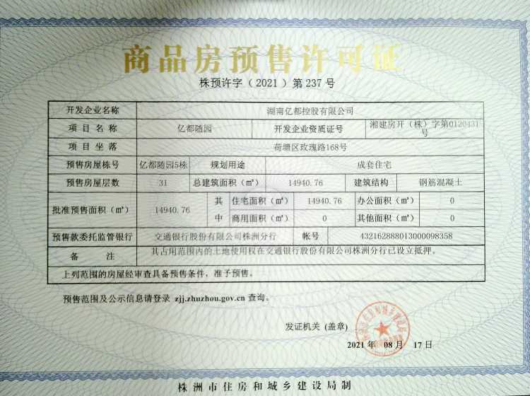 - 预许字(2021)第237号 详情发证时间 2021-08-17绑定楼栋荷塘区玫瑰路168号亿都随园5栋