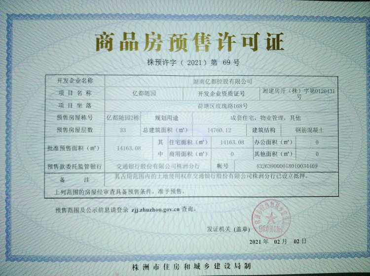 - 预许字(2021)第69号 详情发证时间 2021-02-02绑定楼栋荷塘区玫瑰路168号亿都随园2栋