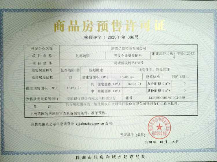 - 预许字(2020)第386号 详情发证时间 2020-10-15绑定楼栋荷塘区玫瑰路168号亿都随园6栋
