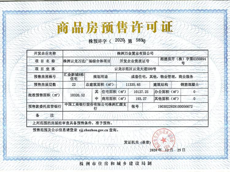 - 预许字(2020)第585号 详情发证时间 2020-12-25绑定楼栋云龙示范区云龙大道599号汇金新城8栋住宅