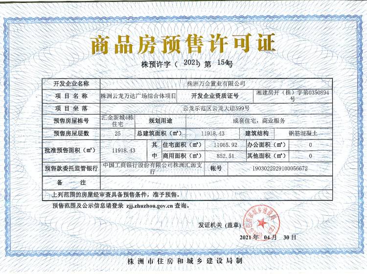- 预许字(2021)第154号 详情发证时间 2021-04-30绑定楼栋云龙示范区云龙大道599号汇金新城4栋住宅