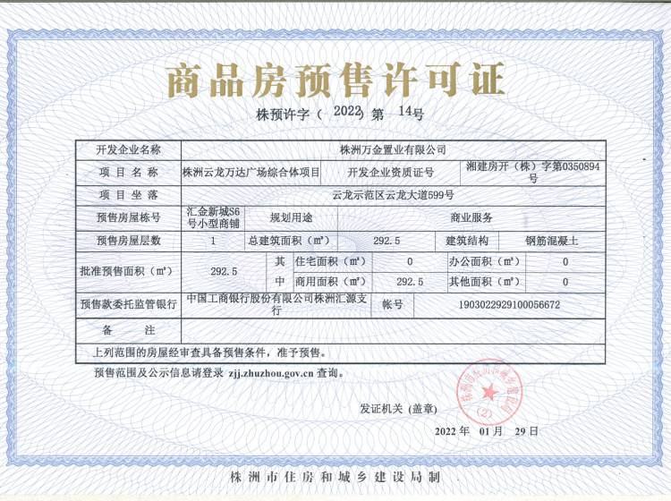 - 预许字(2022)第14号 详情发证时间 2022-01-29绑定楼栋云龙示范区云龙大道599号汇金新城S6号小型商铺