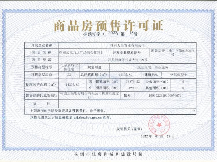 - 预许字(2022)第12号 详情发证时间 2022-01-29绑定楼栋云龙示范区云龙大道599号汇金新城6栋住宅