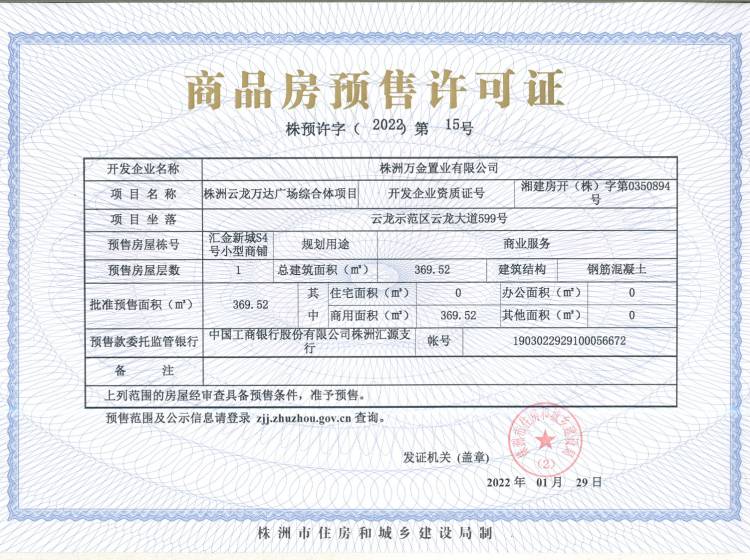 - 预许字(2022)第15号 详情发证时间 2022-01-29绑定楼栋云龙示范区云龙大道599号汇金新城S4号小型商铺