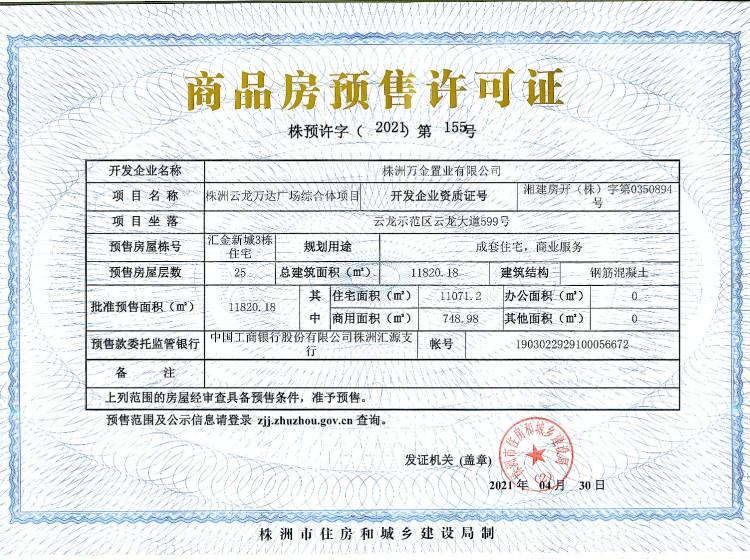 - 预许字(2020)第589号 详情发证时间 2020-12-25绑定楼栋云龙示范区云龙大道599号汇金新城10栋住宅