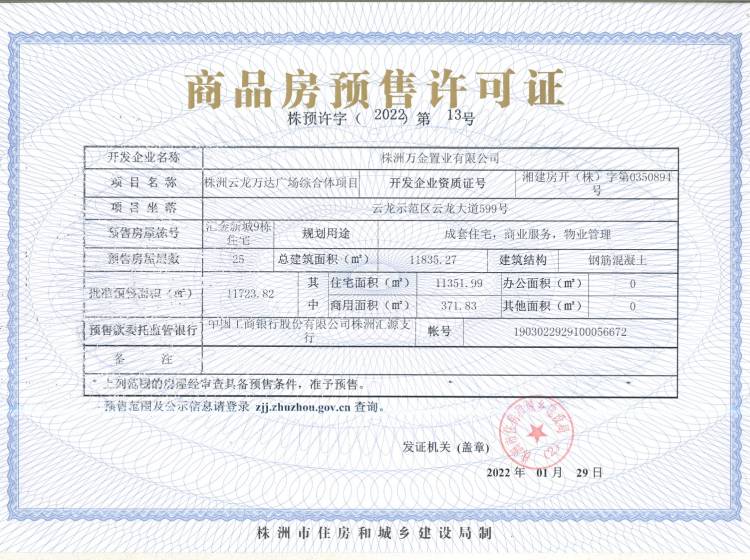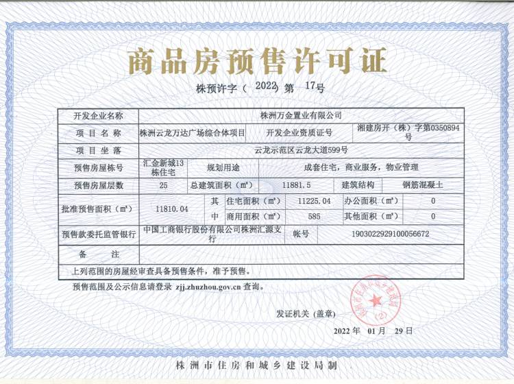 - 预许字(2022)第13号 详情发证时间 2022-01-29绑定楼栋云龙示范区云龙大道599号汇金新城9栋住宅