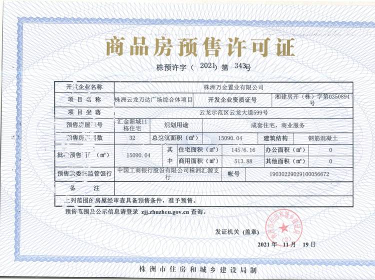 - 预许字(2021)第343号 详情发证时间 2021-11-19绑定楼栋云龙示范区云龙大道599号汇金新城11栋住宅