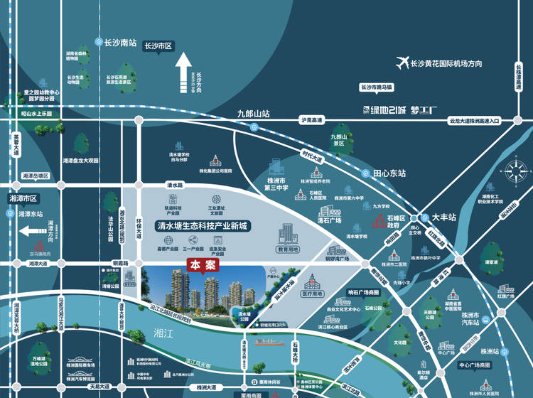 新城周边石峰大道、时代大道、铜霞路3条主干道环伺,衔接京港澳高速、沪昆高速、机场高速,是三城之间交通的枢纽核心。