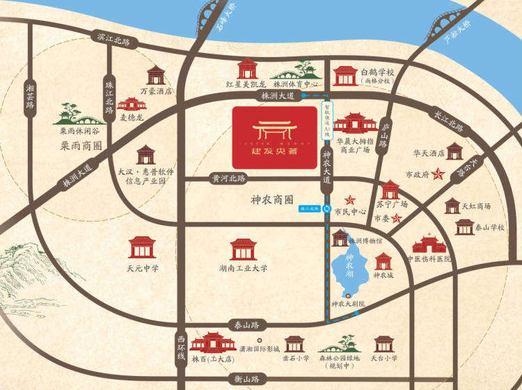 项目地理位置十分优越,北面正对株洲市体育中心,南临4A级景区——“神农城”,临株洲大道、神农大道、黄河北路3条城市主干道,立体交通可快速通全城;项目自建17万方大体量商业,周边2公里范围内有华晨大拇指广场、苏宁广场、神农太阳城、步步高、天虹等繁华商业,生活繁华便利;近临株洲市政府、市党委等市政机构,办事方便;湖南工业大学、建宁中学、天元区白鹤学校等学校周边聚集,株洲市二中莲花中学位于项目内西南角,教育资源优越;株洲大剧院、株洲市博物馆、株洲市美术馆等城市地标建筑皆在周边,坐享醇熟生活。株洲建发·央著以建发传统中式匠意打造株洲人居全新地标。