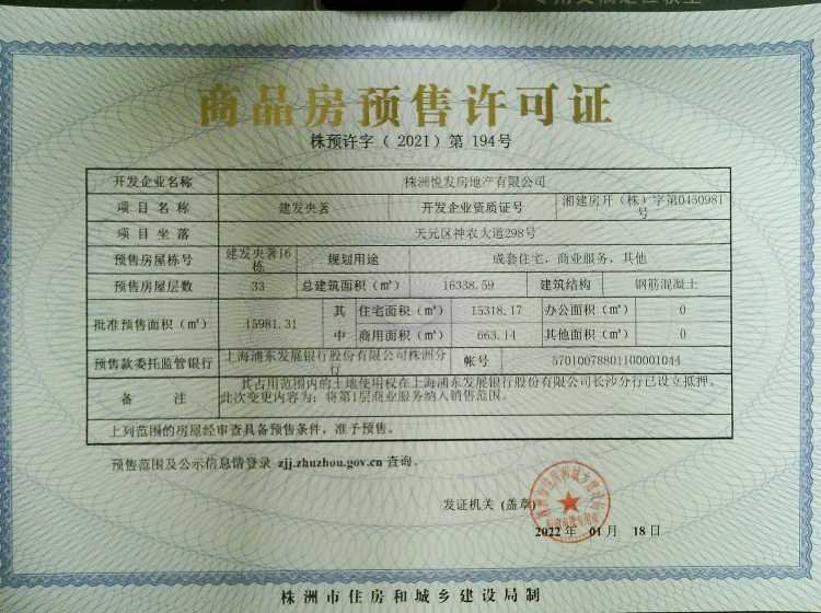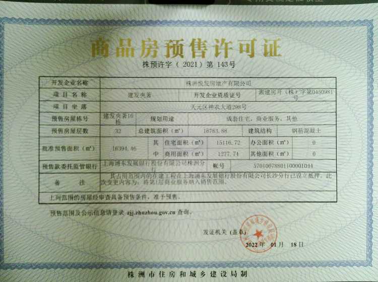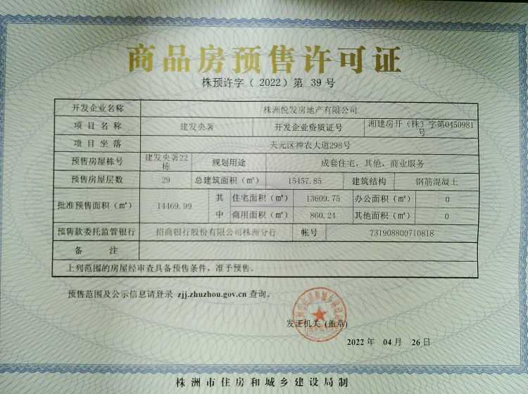 - 预许字(2022)第39号 详情发证时间 2022-04-26绑定楼栋天元区神农大道298号建发央著22栋