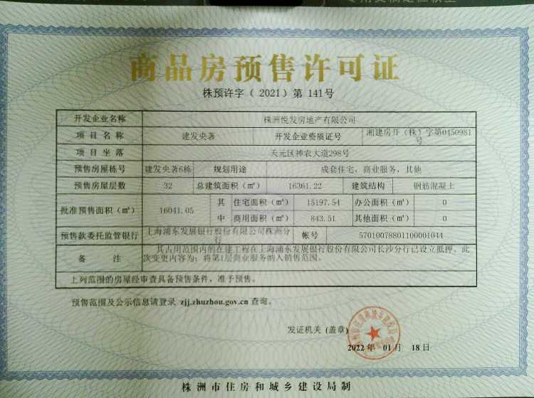 - 预许字(2021)第141号 详情发证时间 2021-04-27绑定楼栋天元区神农大道298号建发央著6栋