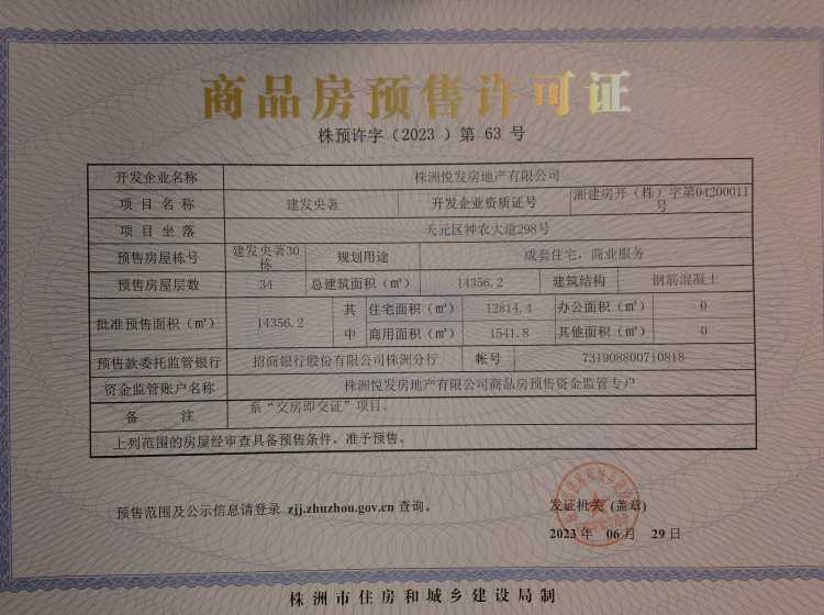- 预许字(2023)第63号 详情发证时间 2023-06-29绑定楼栋天元区神农大道298号建发央著30栋