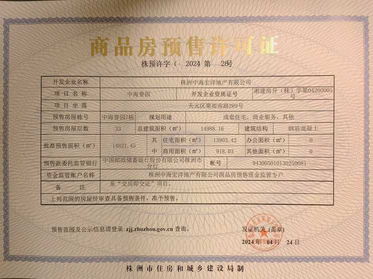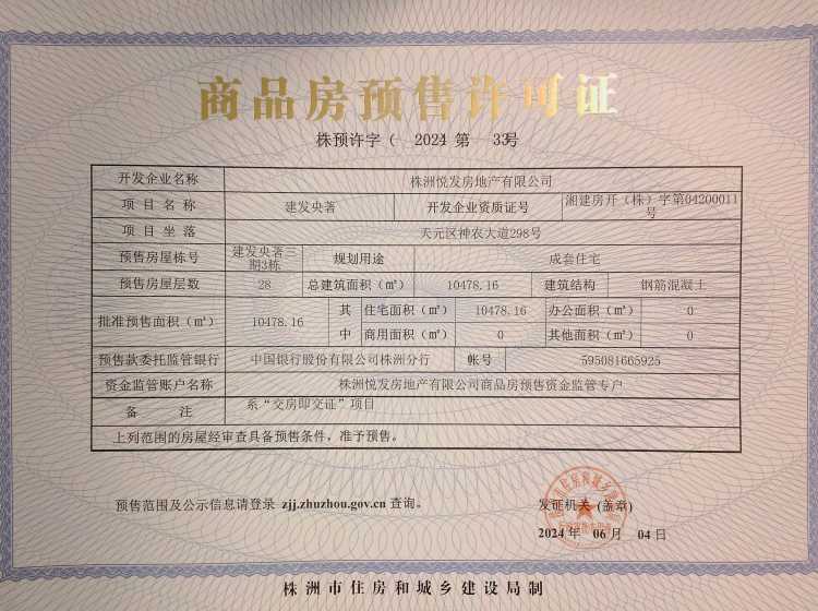 - 预许字(2024)第35号 详情发证时间 2024-06-04绑定楼栋天元区神农大道298号建发央著三期2栋
