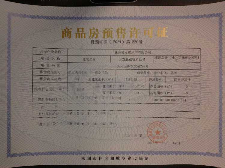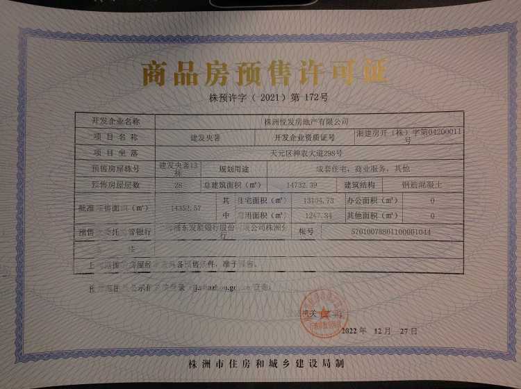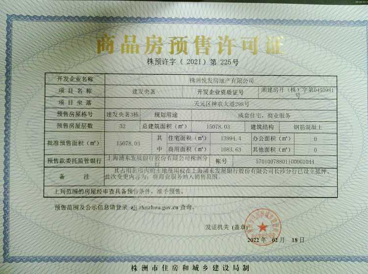 - 预许字(2021)第365号 详情发证时间 2021-12-20绑定楼栋天元区神农大道298号建发央著20栋