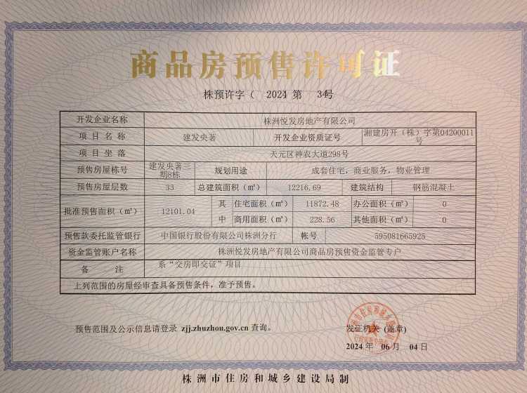 - 预许字(2024)第33号 详情发证时间 2024-06-04绑定楼栋天元区神农大道298号建发央著三期3栋