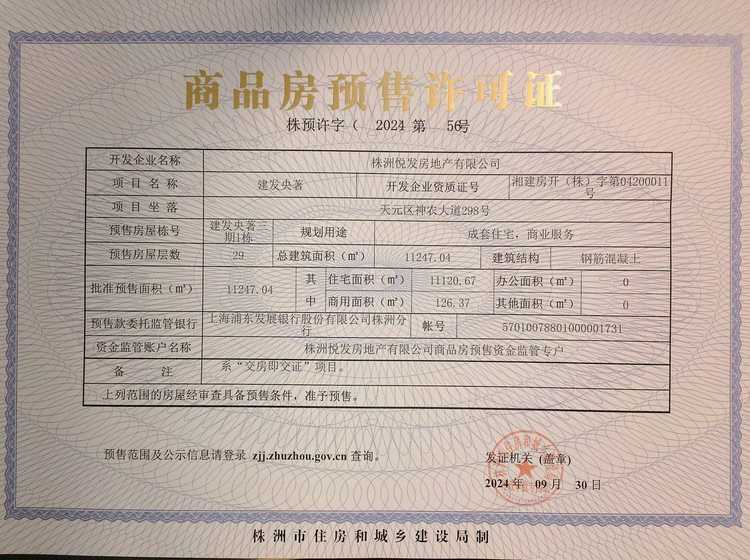- 预许字(2024)第56号 详情发证时间 2024-09-30绑定楼栋天元区神农大道298号建发央著三期1栋