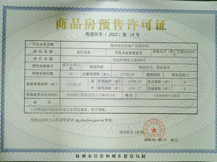 - 预许字(2022)第19号 详情发证时间 2022-02-18绑定楼栋天元区神农大道298号建发央著23栋