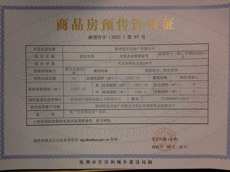 - 预许字(2023)第87号 详情发证时间 2023-09-22绑定楼栋天元区神农大道298号建发央著29栋