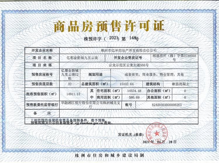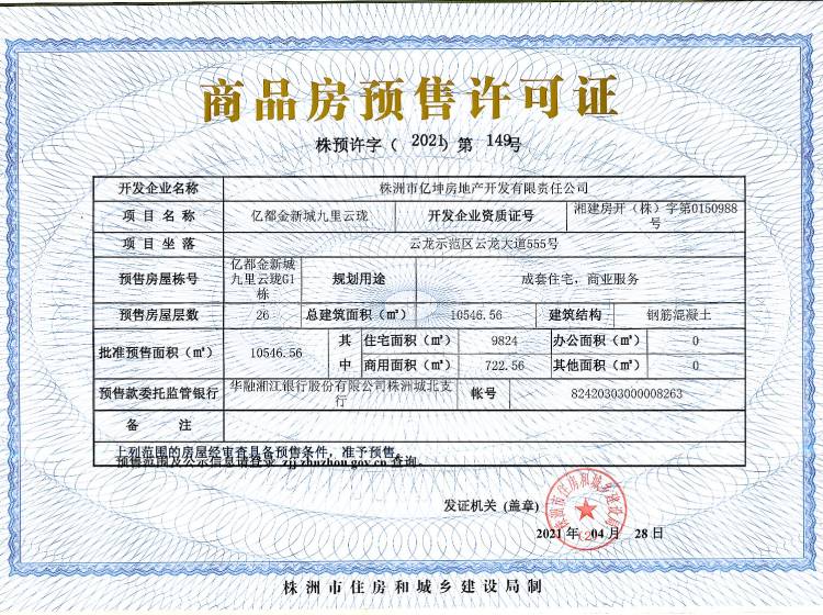 - 预许字(2021)第149号 详情发证时间 2021-04-28绑定楼栋云龙示范区云龙大道555号亿都金新城九里云珑G1栋