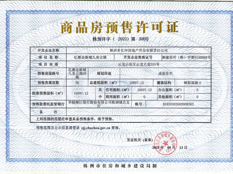 - 预许字(2021)第306号 详情发证时间 2021-09-13绑定楼栋云龙示范区云龙大道555号亿都金新城九里云珑G8栋