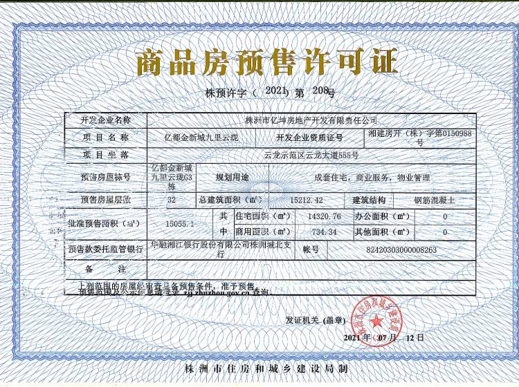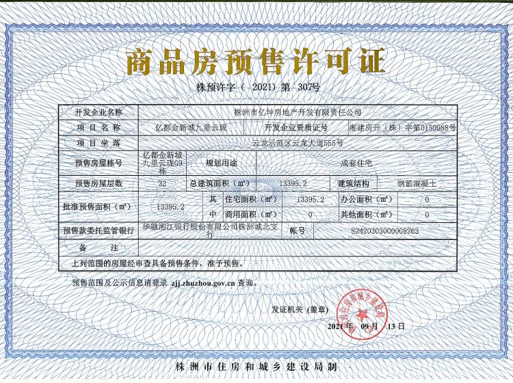 - 预许字(2021)第307号 详情发证时间 2021-09-13绑定楼栋云龙示范区云龙大道555号亿都金新城九里云珑G9栋
