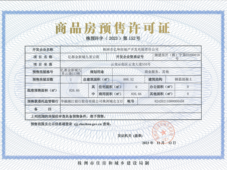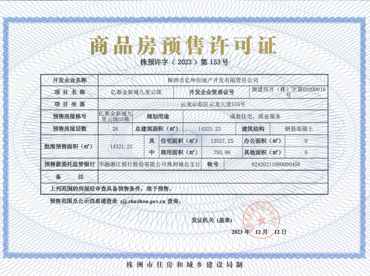 - 预许字(2023)第153号 详情发证时间 2023-12-12绑定楼栋云龙大道555号亿都金新城九里云珑G5栋
