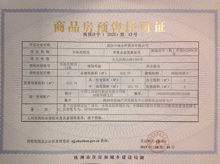 - 预许字(2025)第43号 详情发证时间 2025-10-09绑定楼栋天元区湘山路1368号华地美墅湾S1栋