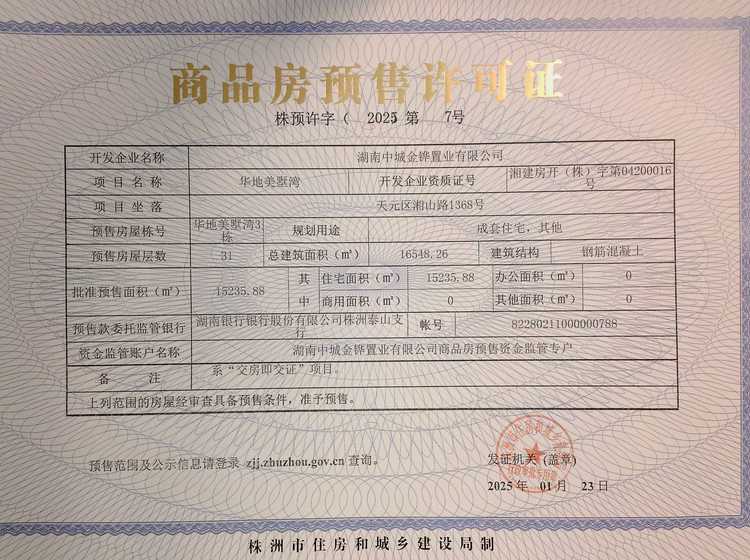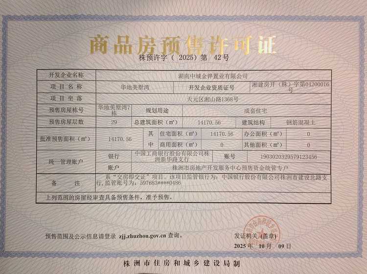 - 预许字(2025)第42号 详情发证时间 2025-10-09绑定楼栋天元区湘山路1368号华地美墅湾7栋