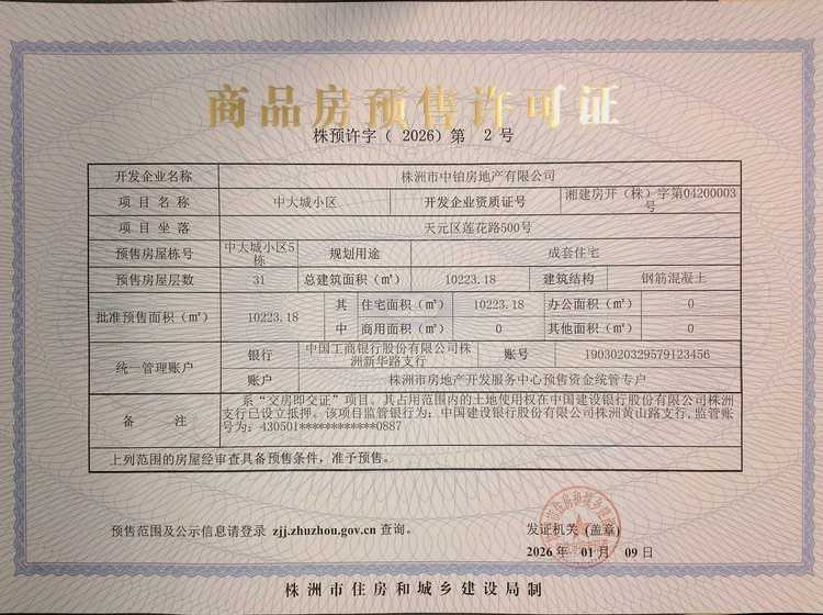 - 预许字(2026)第2号 详情发证时间 2026-01-09绑定楼栋天元区莲花路500号中大城小区5栋