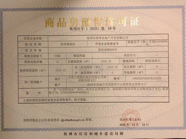 海琴臻境是由株洲市海琴房地产开发有限公司打造的高品质住宅项目,位于株洲市天元区月塘片区核心区域,位置处在栗雨南路与泉源路交汇的地方。项目总用地面积约3.5万平方米,项目由12栋8-10层洋房加2栋小高层组合而成,总计409套高端住宅,致力于为株洲市民呈现一座现代宜居的生活典范。