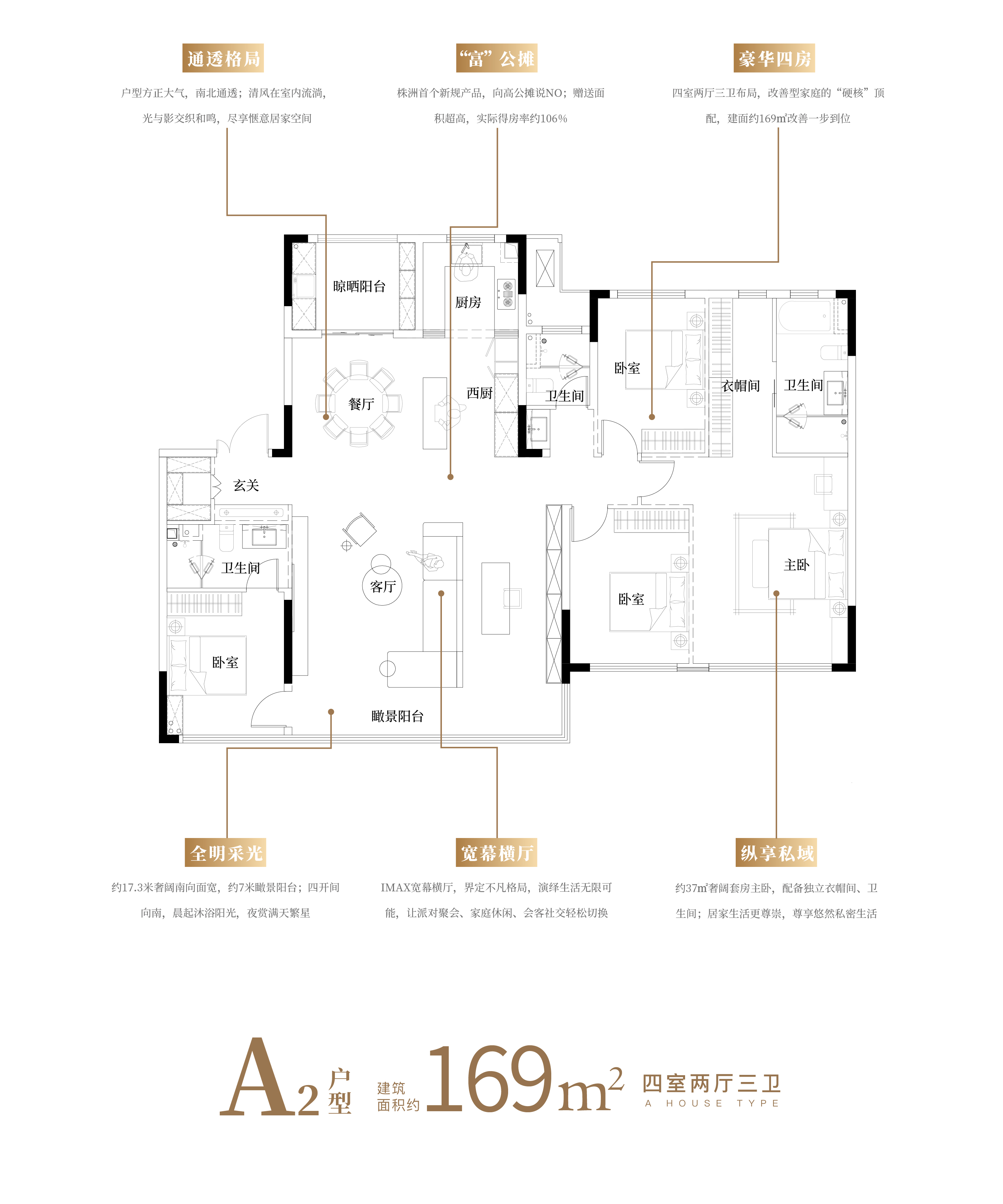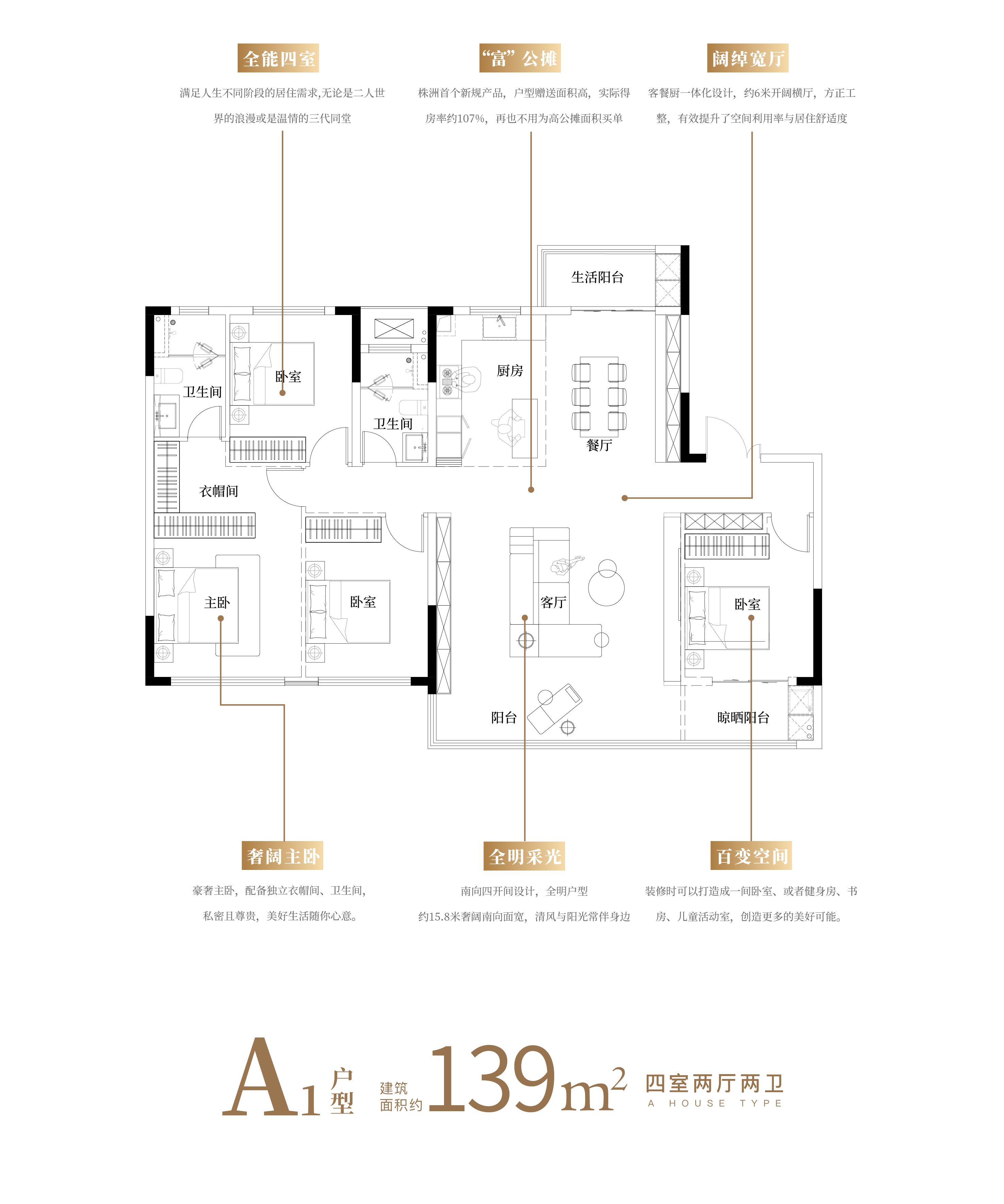 户型设计:主推低密度洋房,建面约139㎡的“全能四房”户型,采用客餐厨一体化设计,空间方正工整。此户型拥有约15.8米南向大面宽与3.15米层高的同时,保障了充足的采光与新鲜空气的流通性。通过全赠送飘窗、设备平台以及半赠送瞰景阳台高赠送面积设计,实现了实际得房率超104%的突破,完成客户实现“零公摊”的购房体验