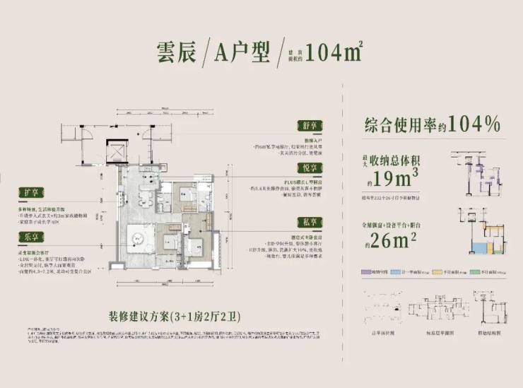如果你是新婚小家庭或首次改善,104㎡三房绝对是“性价比天花板”——建面刚过百,实际使用堪比传统120㎡户型,每一寸空间都用到刀刃上: