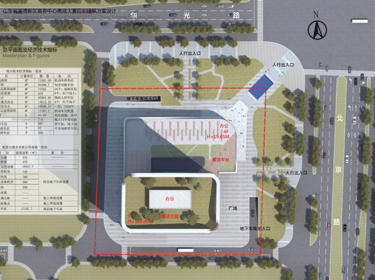 商业裙楼部分总建筑面积约1.5万平米,首层层高5米,二层4.5米,三层四层4.2米,占据北京路华光路交汇处西南角较佳商业位置,根据功能分布需求,整体打造为集主力店商铺、商务配套服务、休闲配套服务、商务办公为一体的综合商业形态